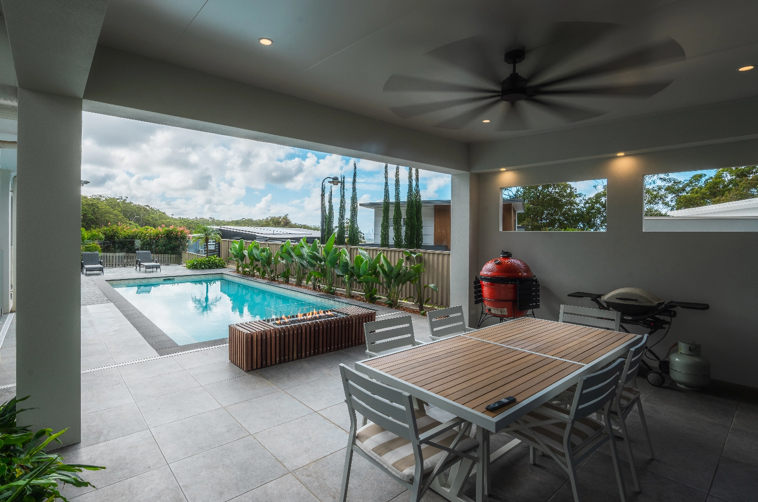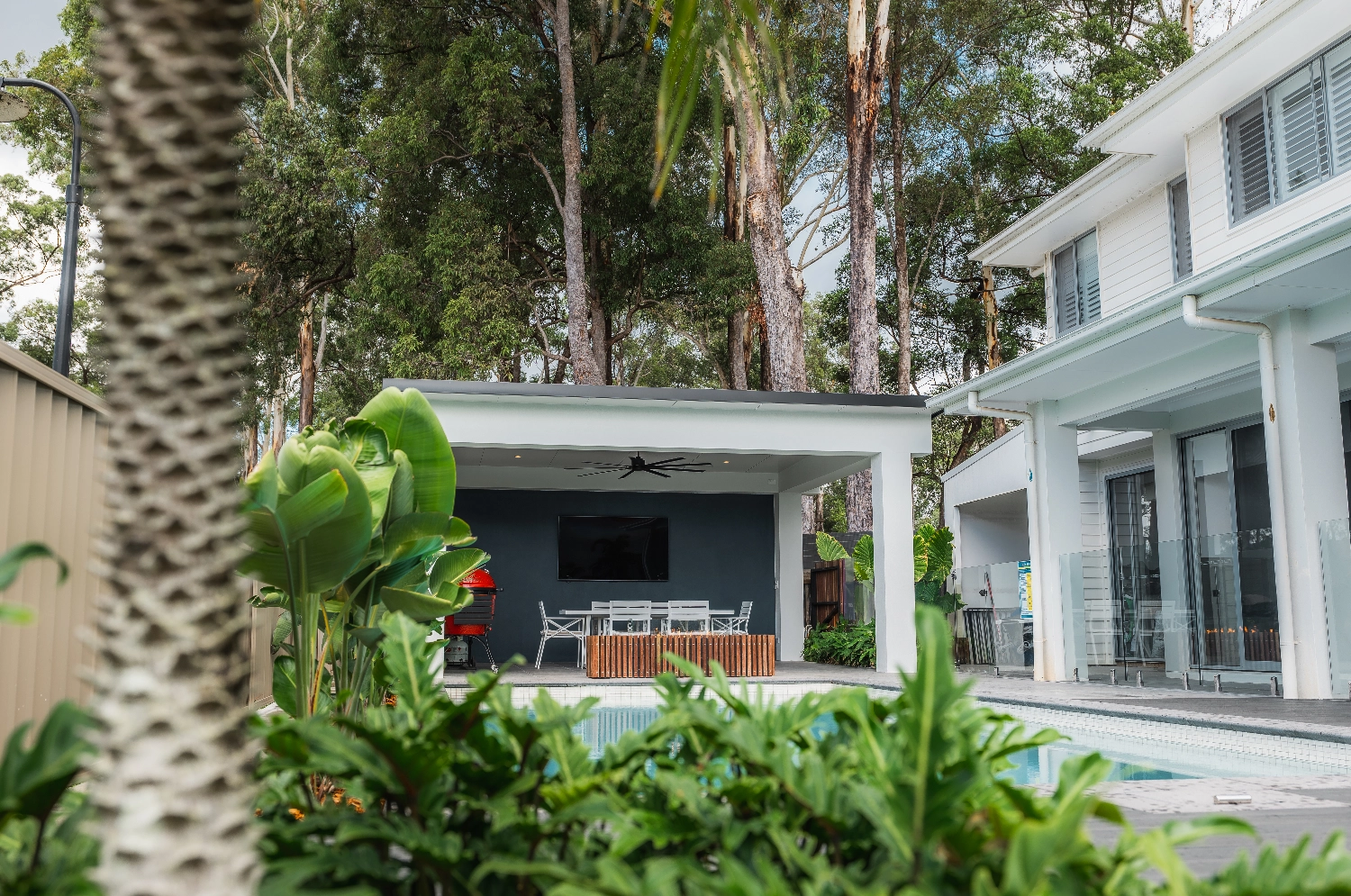 This client wanted an outdoor room that he could have shade from the harsh QLD sun and prevailing weather. He wanted a Pool Cabana that blended in with existing property, rendered and painted bulkheads and columns.